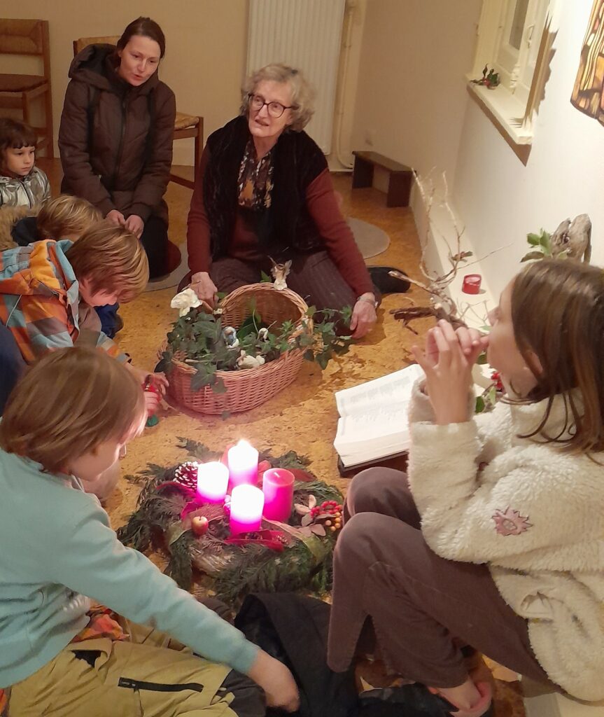 Aujourd’hui, pendant que les adultes pensent et prient ensemble, les enfants se mettent au travail : c’est bientôt Noël et les étoiles vont pleuvoir dans le ciel de l’oratoire, mais pour cela il faut les fabriquer, alors tout le monde s’y met !